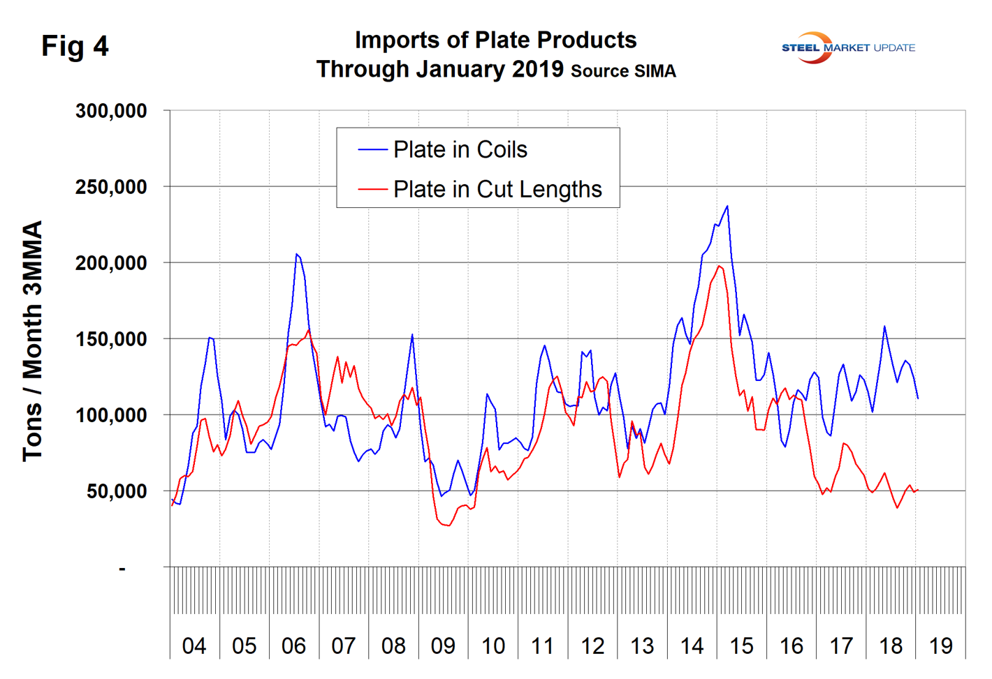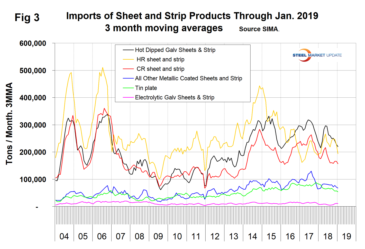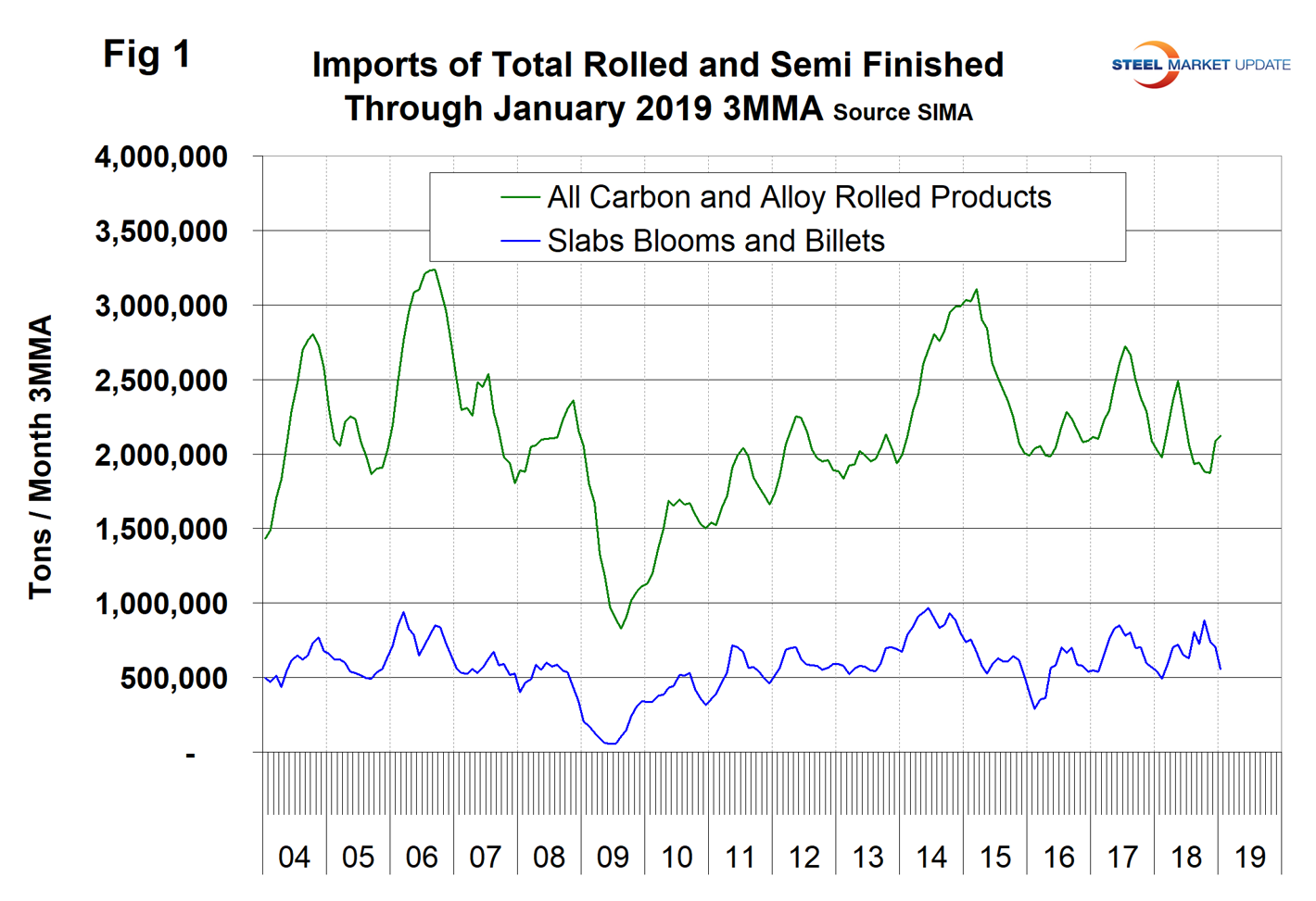 Figure 1 shows the tonnage of total rolled steel and semi-finished imports through January on a 3MMA basis. Total rolled product volume declined from May through November and picked up in December and January. Evidently Section 232 has had no effect on semi-finished products. Except for early 2016 (when the volume was very low), the import volume of semis on a 3MMA basis has cycled between 490,000 and 930,000 tons per month for the last seven years.