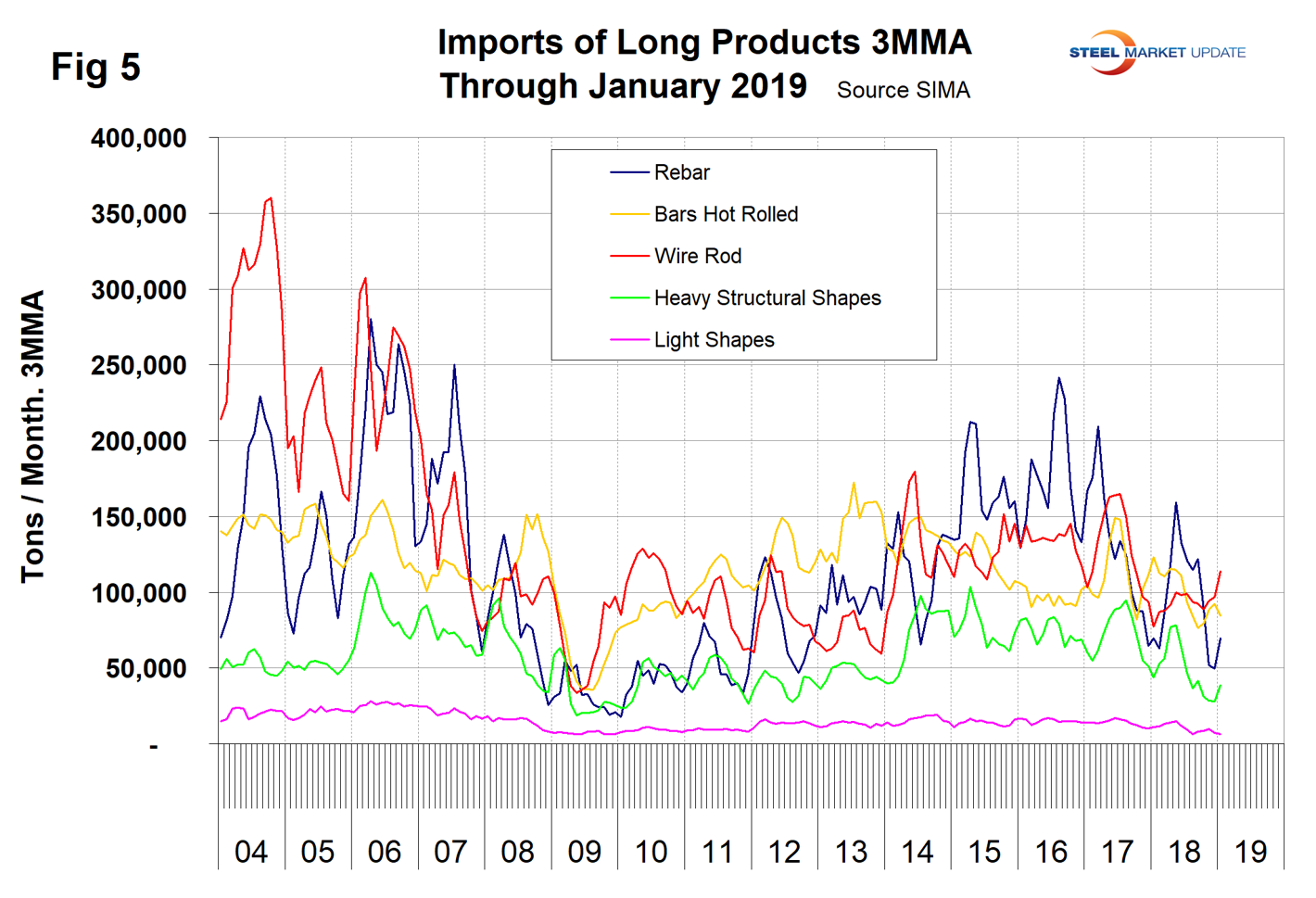 Table 2 shows the same analysis for long products where the year-over-year volume was down by 6.3 percent in total. Rebar was up slightly, wire rod surged and the other products declined. Figure 5 shows the history of long product imports.