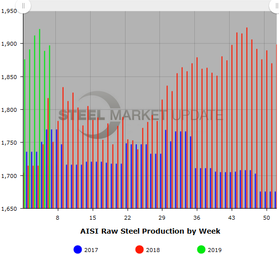 The average capability utilization for U.S. steelmakers hit 81.5 percent in the week ending Feb. 9, the highest rate in about three months, with the mills producing 1,897,000 net tons of steel. Production increased 0.4 percent from the prior week and was up 4.4 percent from the same week the prior year, reported the American Iron and Steel Institute.