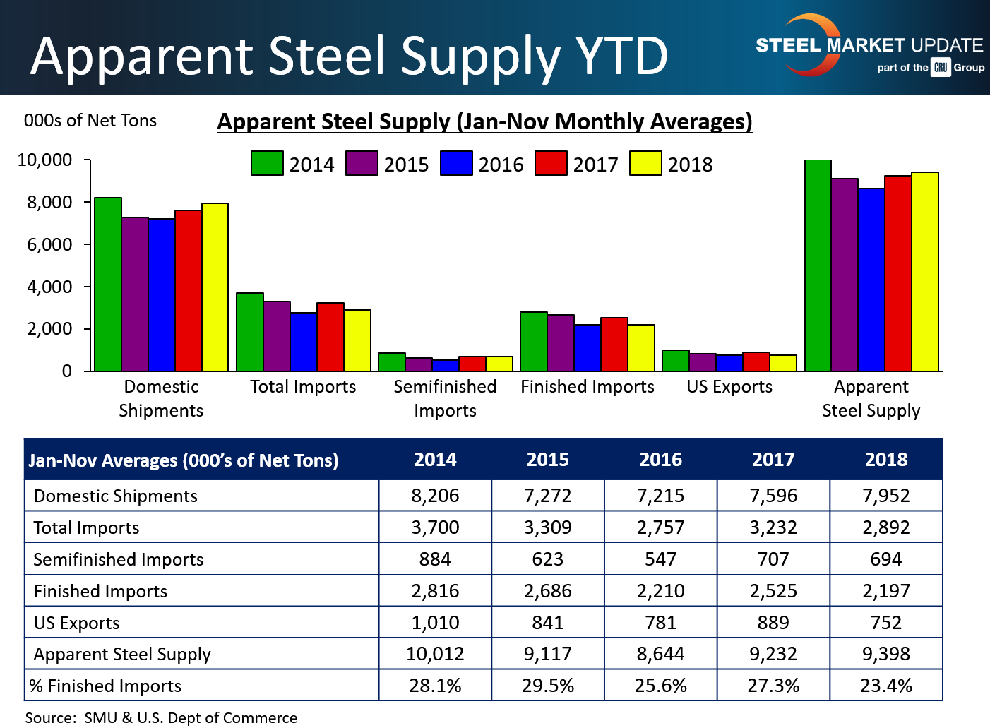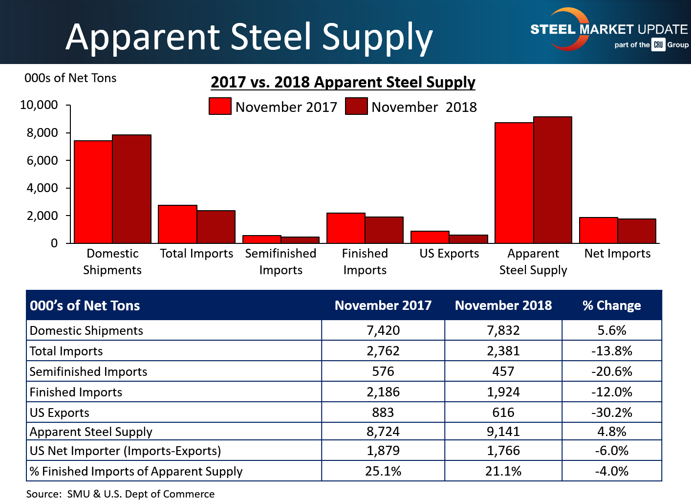 November apparent steel supply saw a 417,102 ton or 4.8 percent increase compared to the same month one year ago. This change was primarily due to an increase in domestic shipments of 412,146 tons or 5.6 percent. A decrease in finished imports of 261,890 tons or 12.0 percent was neutralized by a decrease in total exports of 266,846 tons or 30.2 percent.