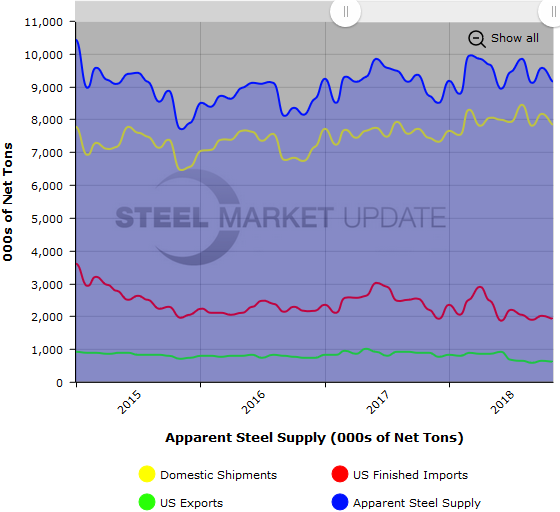 To see an interactive graphic of our Apparent Steel Supply history (example below), visit the Apparent Steel Supply page in the Analysis section of the SMU website. If you need any assistance logging in or navigating the website, contact us at info@SteelMarketUpdate.com or 800-432-3475.
