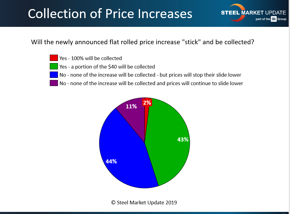 Looking at the data, very few expect the mills to collect the full $40 per ton increase they announced last month. More than 11 percent expect the announcement to have no effect at all and that steel prices will continue declining.