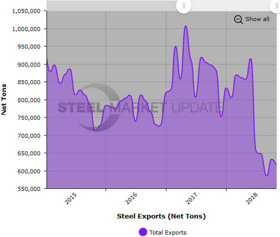 U.S. steel exports in November totaled 615,818 net tons (558,661 metric tons), down 2.4 percent from October, and down 30.2 percent from levels one year ago.