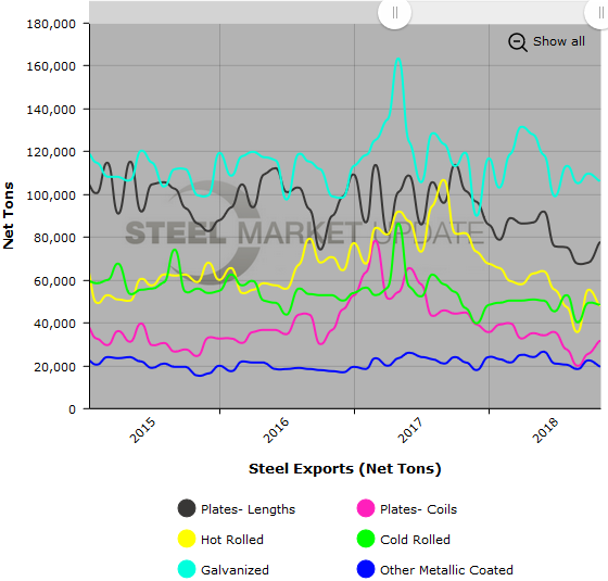 Exports of all other metallic coated products came in at 19,439 tons, a 13.2 percent decrease from October, and a 9.1 percent decrease compared to one year ago.