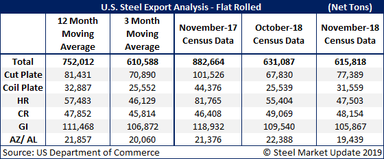 After the September 2018 low of 584,858 tons, last November is the next lowest month for exports since February 2009 when 602,945 tons of steel were exported outside of the United States. Looking back to the first half of 2018, total exports were averaging around 850,000 tons per month for over a year, with the only sub-800,000 figure being in December 2017.