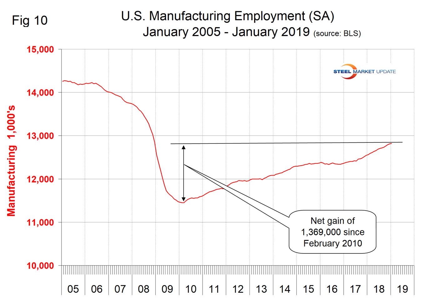 Manufacturing employment plummeted during the recession and gradually improved from the spring of 2010 through 2014. Growth was flat in 2015 and declined slightly in 2016 when 23,000 jobs were lost during the year as a whole. There was a turnaround in 2017 and in the 12 months from February 2018 through January 2019, 261,000 manufacturing jobs were created (Figure 10). The motor vehicles and parts subcomponent of manufacturing employment had a net gain of only 22,000 in the same time frame.