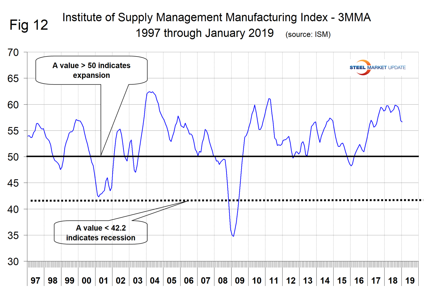 The Institute for Supply Management’s Manufacturing Index is a diffusion index. ISM states: “Diffusion indexes have the properties of leading indicators and are convenient summary measures showing the prevailing direction of change and the scope of change. An index value above 50 indicates that the manufacturing economy is generally expanding; below 50 indicates the opposite.” Figure 12 shows the 3MMA of the ISM index from January 1997 through January 2019. The index surged from January 2016 through October 2017, but has declined every month since August last year. The 3MMA of the index in January was 56.63, down from 59.87 in August and down by 2.23 percent year over year.