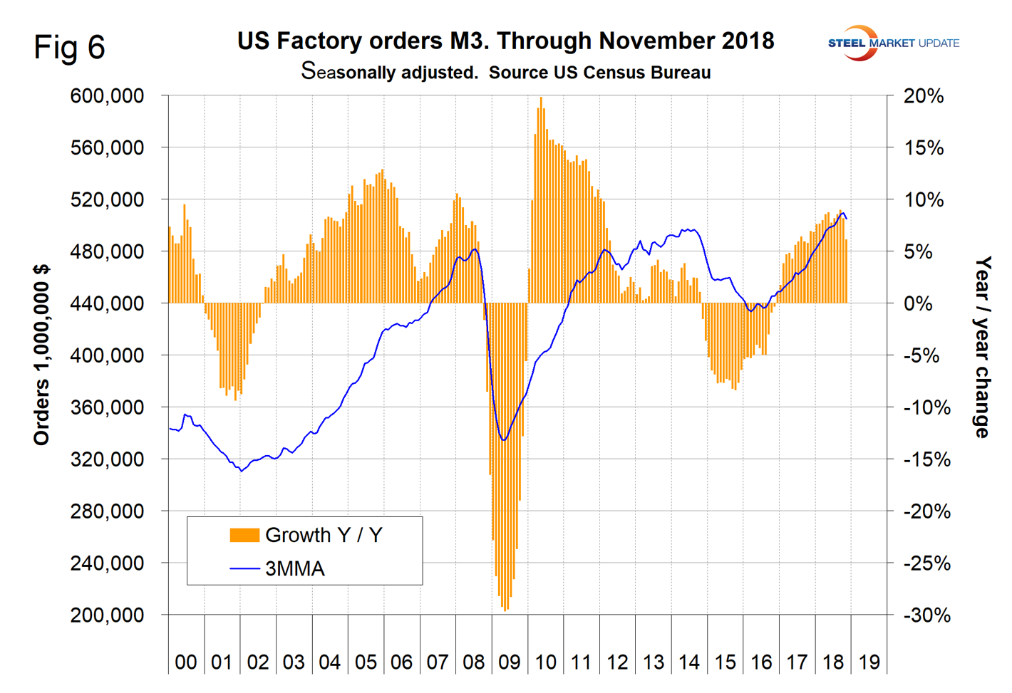 The U.S. Census Bureau has not caught up from the shutdown and is a month in arrears. New orders for manufactured durable goods in November were unchanged from September and October on a 3MMA basis month over month and were up by 6.9 percent year over year. Figure 4 shows the 3MMA since January 2010 and that the rate of improvement in 2018 was the highest since 2014.