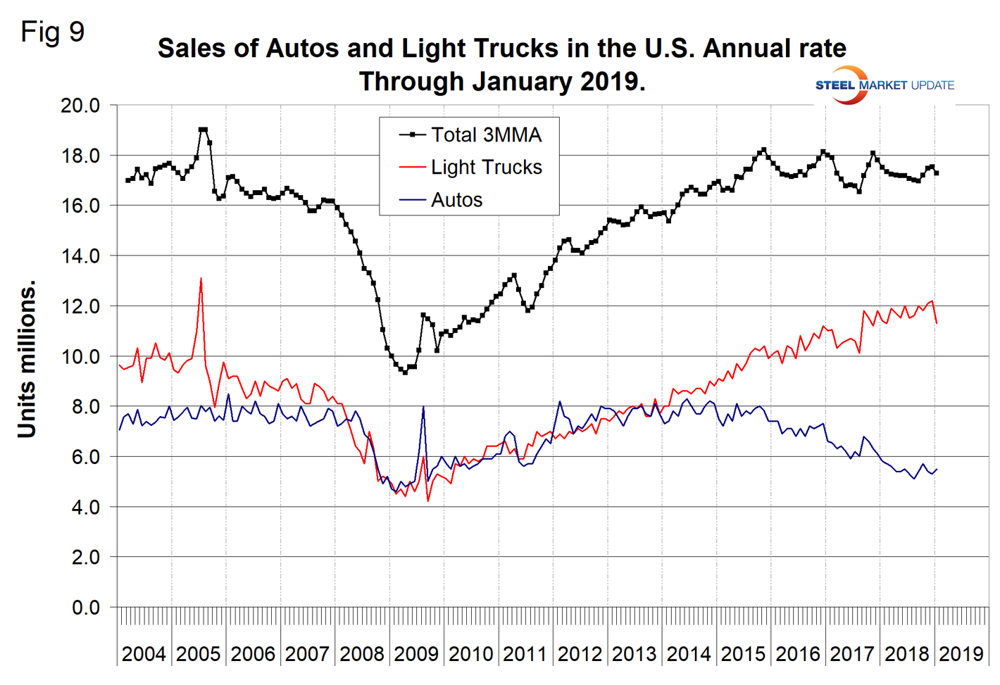 Automobile sales have trended down slightly in the last three years as measured by the cyclical peaks. Year over year on a 3MMA basis, sales were down by 1.3 percent. Sales in January totaled 16.7 million units annualized and were comprised of 67.3 percent light trucks and 32.7 percent autos. The declining sale of autos in the last three years has resulted in GM announcing its intent to close several small car plants. The light truck category includes SUVs and crossovers. Overall, sales are still higher than the pre-recession level (Figure 9). Import market share in January was 22.8 percent and has been drifting up since March last year.