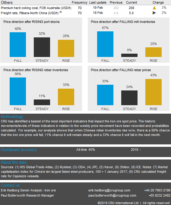 With weak demand side, we expect prices to continue to decline in the coming week. Australian supply has improved and there are currently no threats of cyclones in Northwestern Australia. Port stocks are high at the moment, which means any short-term rise in demand can by met by destocking at ports.
