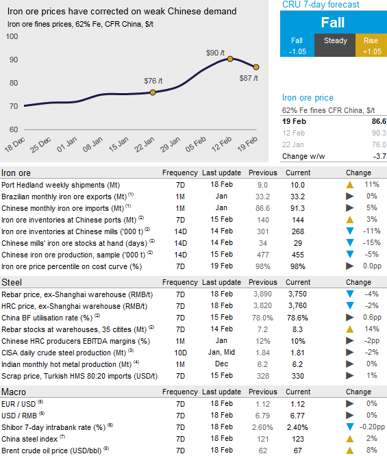 During the past week, iron ore prices fell somewhat as weak Chinese demand continued to weigh on the market. On Tuesday, Feb. 19, CRU assessed the 62% Fe fines price at $86.60 /t, down $3.70 /t w/w.