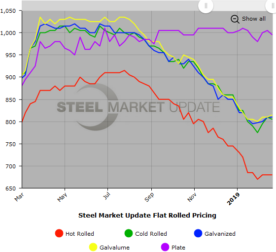 SMU Note: Below is a graphic showing our hot rolled, cold rolled, galvanized, Galvalume and plate price history. This data is available here on our website with our interactive pricing tool. Note that plate prices are not yet available on our website, but we are in the process of adding that dataset. If you need help navigating the website or need to know your login information, contact us at info@SteelMarketUpdate.com or 800-432-3475.