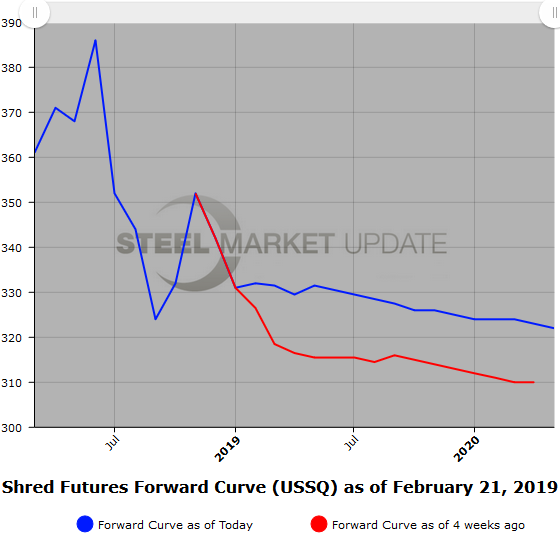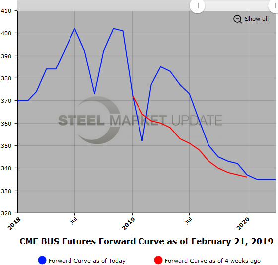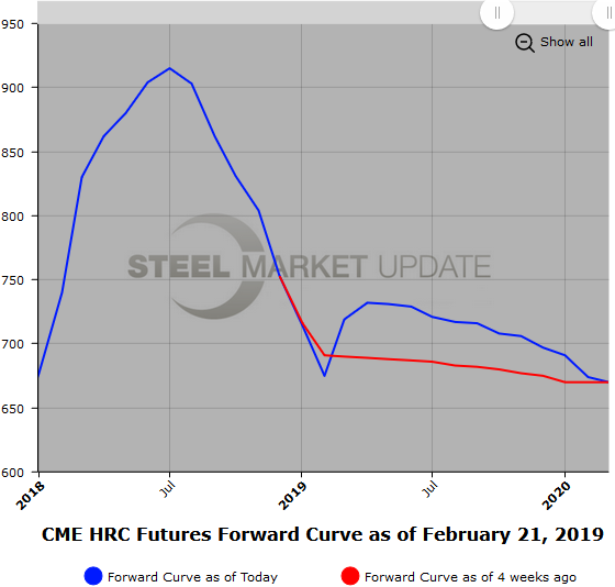 The HR price increases announced, assuming they are reflected in the indexes, should dampen the roughly $45/ST contango we have seen between the indicated spot sales and Q2’19 HR future ($680 spot vs $725 Q2’19 value Feb. 15).