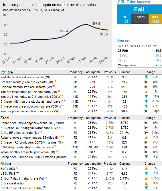 Iron ore prices declined for the second consecutive week as the market awaits the announcement of stimulus measures in China. On Tuesday, Feb. 26, CRU has assessed the 62% Fe fines price at $84.70 /t, down $1.90 /t w/w.