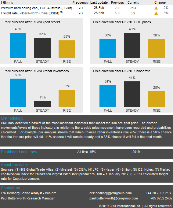 We expect prices to decline again in the coming week due to weak demand and high steel stocks. On the supply side, shipments from Port Hedland decreased slightly in the past week, but were in line with the 2019 average to date and should be stable next week as there are currently no cyclone threats. Port stocks in China increased in the past week and are now at the highest level in 2019, therefore any increases in demand in the coming week will be met by drawing down port inventories. The critical factor will be the outcome from the National People’s Congress; without an announcement of significant stimulus in the next week, overall conditions in China will remain weak.