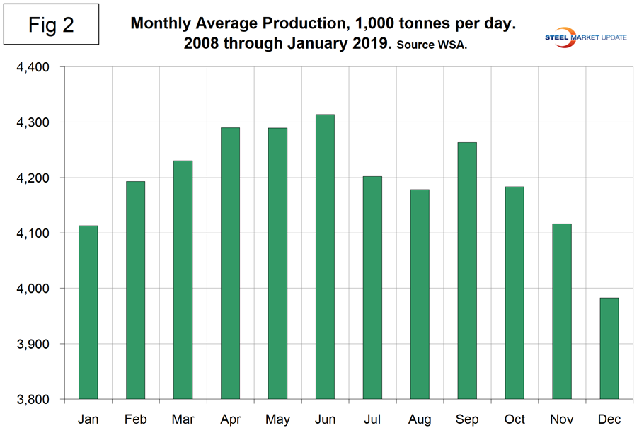 On average, global production on a tons per day basis peaked in the early summer in the years 2010 through 2016, but in 2017 and 2018 the second half downtrend was delayed until the fourth quarter on a 3MMA basis. Figure 2 shows the average tons per day of production for each month since 2008. On average, January increased by 3.26 percent. This year, January declined by 1.97 percent.