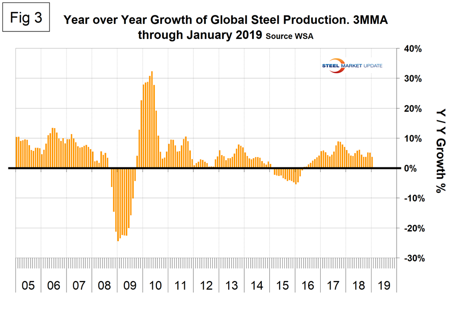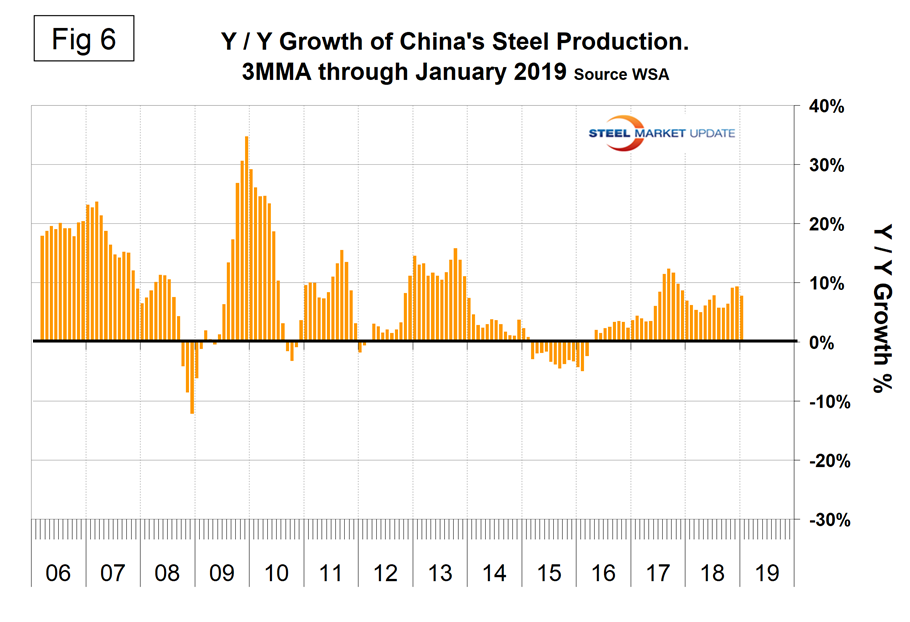 Figure 5 shows China’s production since 2005 and Figure 6 shows the year-over-year growth. China is increasingly dominating the global steel market and will likely have months in 2019 when the annualized rate will exceed one billion metric tons of crude production. The WSA is forecasting a deceleration in China’s steel production growth in 2019. The chairman of the World Steel economics committee stated recently that China is expected to experience zero growth in 2019, down from 6 percent in 2018. This is partly a result of trade tensions with the U.S., he reported.