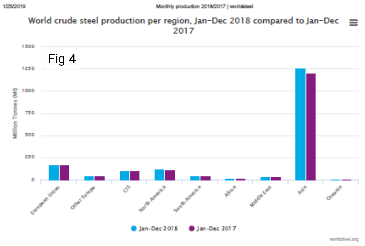 Last month we included Figure 4 and are showing it again because it is so dramatic. It is copied from the WSA website and shows the distribution of steel production in the regions of the world in 2017 and 2018.