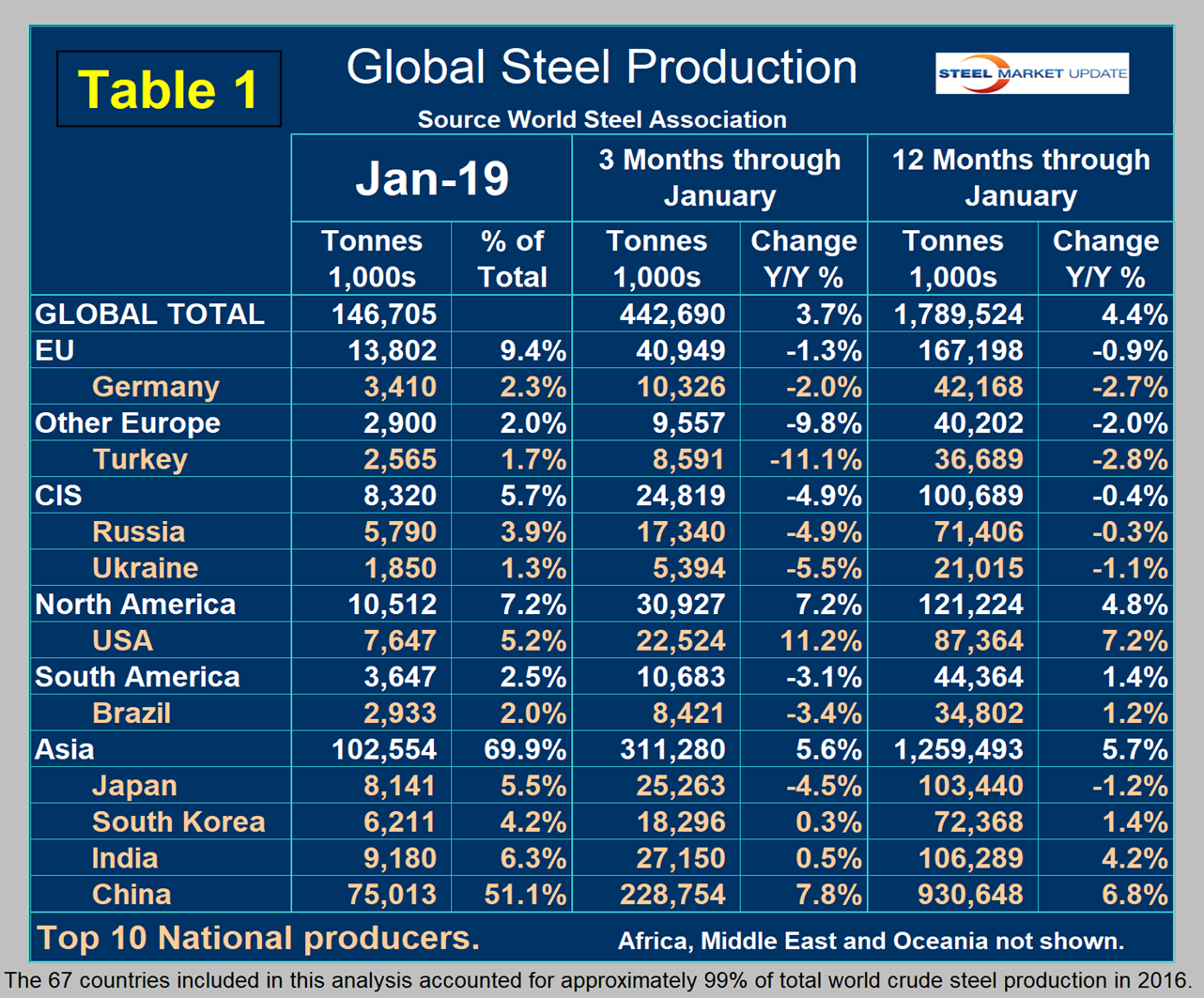SMU Comment: The rest of the world had negative year-over-year growth in steel production in three months through January, but China kept on rolling along. We don’t believe the WSA projection of zero growth in China’s steel production in 2019, but hope we are wrong. New plants are coming on stream in China and almost all of these are BOF-based, according to the August report by the OECD Steel Committee.