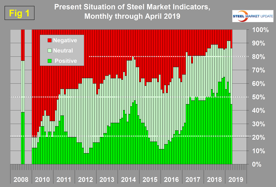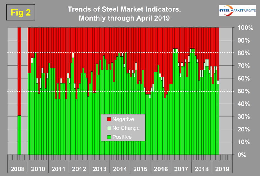 Our observations about trends in the April data are as follows: In the general economy, consumer confidence and the yield spread improved and the value of the U.S. dollar strengthened, which we class as a negative. All the raw materials experienced a trend reversal. Iron ore trended positive, while scrap, coking coal and zinc trended negative and pig iron went from negative to no change. In the steel sections, the prices of rebar and hot rolled coil both reversed to the negative, as did both shipments and supply of sheet products. The only trend change in construction and manufacturing was that the ISM manufacturing index reversed from negative to positive. Four out of six construction indicators are now trending positive as are four out of five manufacturing indicators.