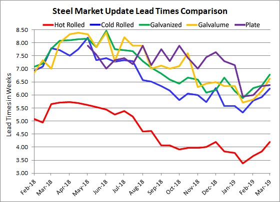 Hot rolled lead times now average 4.19 weeks, up from 3.38 weeks in mid-January. While significantly longer, current lead times for hot rolled are still well below the 5.65 weeks at this time last year.