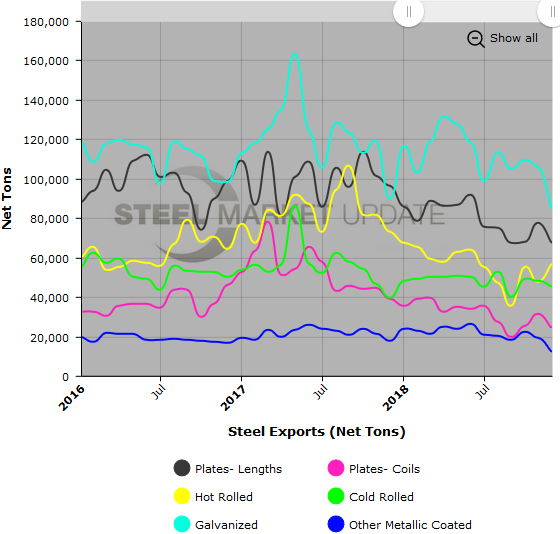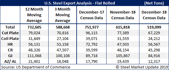 Hot rolled steel was the only product with an increase in month-over-month exports, rising 19.1 percent over November to 56,567 tons, but down 22.3 percent from December 2017 levels.
