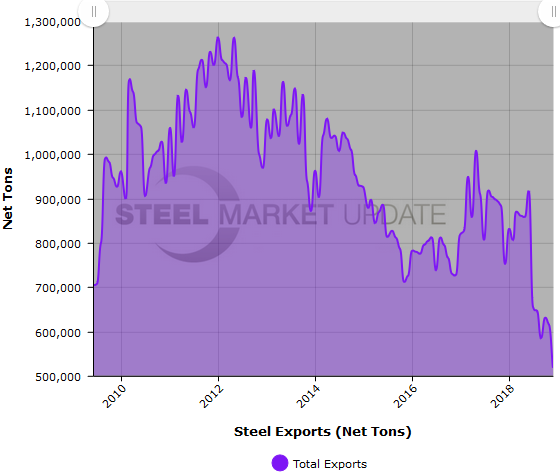 The last time total steel exports were this low was over 16 years ago, back in July 2002, when 504,621 tons of steel were exported outside of the United States. For comparison, in the first half of 2018, total exports averaged around 850,000 tons per month and had been in that ballpark since early 2017.