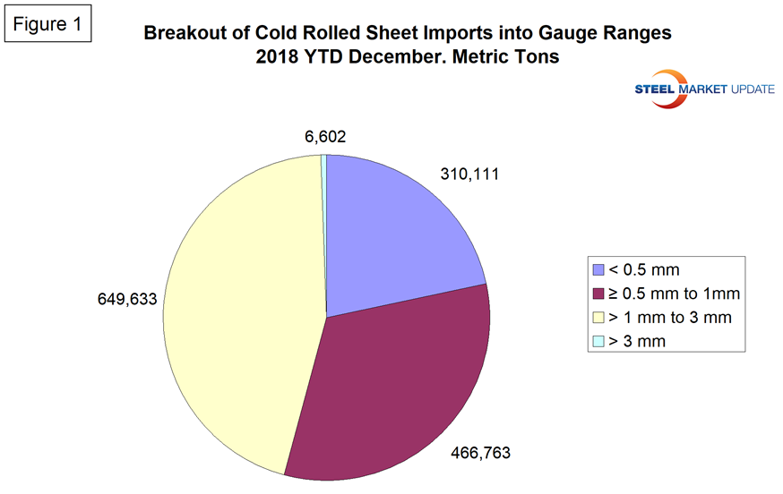 Figure 1 breaks the year-to-date cold rolled sheet tonnage down into the four gauge ranges that are identified in the HTS codes. Year to date December, 21.6 percent was < 0.5 mm, 32.6 percent was ≥ 0.5 mm to 1.0 mm, 45.3 percent was >1.0 to 3.0 mm, and 0.5 percent was > 3.0 mm.