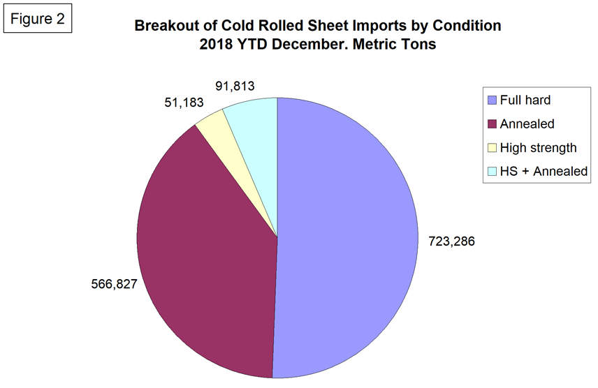 Through December 2018, of the total cold rolled sheet and strip imports into the U.S., only 2.7 percent was strip; 45.3 percent of the CR sheet imports were >1 to 3mm thick and 50.5 percent was full hard.