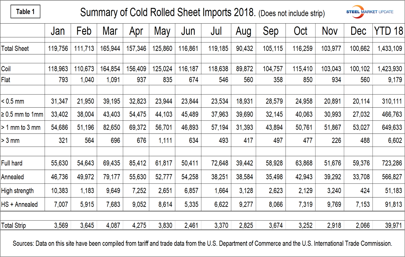 Using U.S. International Trade Commission (USITC) data, SMU has taken the import tonnage of cold rolled sheet and broken it down into coil and leveled; then it breaks out four thickness ranges and identifies how much was full hard, annealed and high strength. Finally, this analysis is taken to the district of entry level. Total 2018 sheet and strip imports through December were 1,433,109 and 39,971 metric tons, respectively.