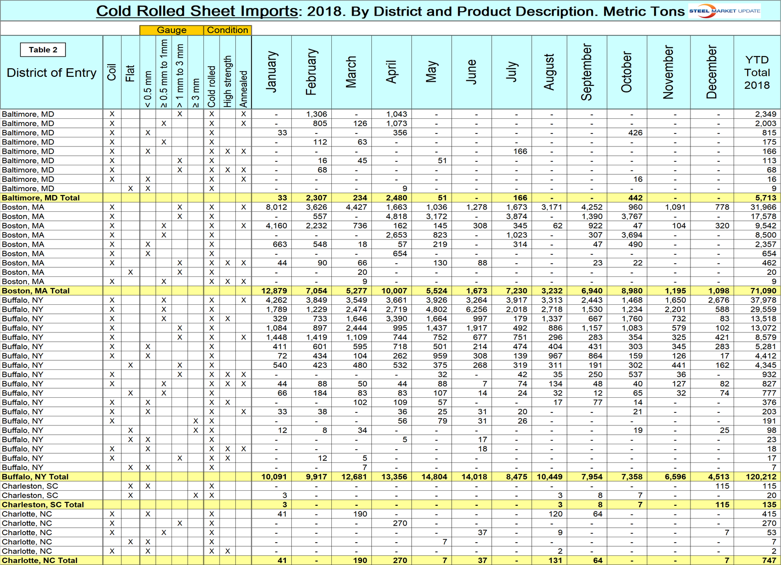 Table 2 is a small part of a sheet that shows detail for every region in the U.S. and is available here for download. It shows the product detail of cold rolled sheet imports by district of entry. For example, the highest volume item entering Buffalo in 2018 was ≥0.5 to 1 mm annealed. To cite another example, if a steel buyer in the Detroit region wanted to know how much high-strength annealed >1 to 3 mm had entered through that district year to date, the answer is 47,237 metric tons, and he/she can see that the monthly breakdown of that volume has been very consistent suggesting repeat contractual volume. The buyer, knowing his/her own activity, would then know more about the activities of competing companies in that region.