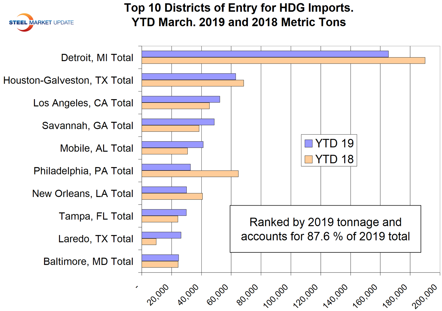The table included here is a small part of the detailed analysis of the HDG sheet tonnage. The bar graph shows the tonnage that entered the top 10 districts through March year to date for 2018 and 2019 ranked by 2019 tonnage. These 10 districts accounted for 87.6 percent of the HDG total in 2019 YTD. Detroit had by far the most volume in 2019 through March and was down by 13 percent compared to 2018. Canada supplied almost all of the HGD tonnage into Detroit in 2019.