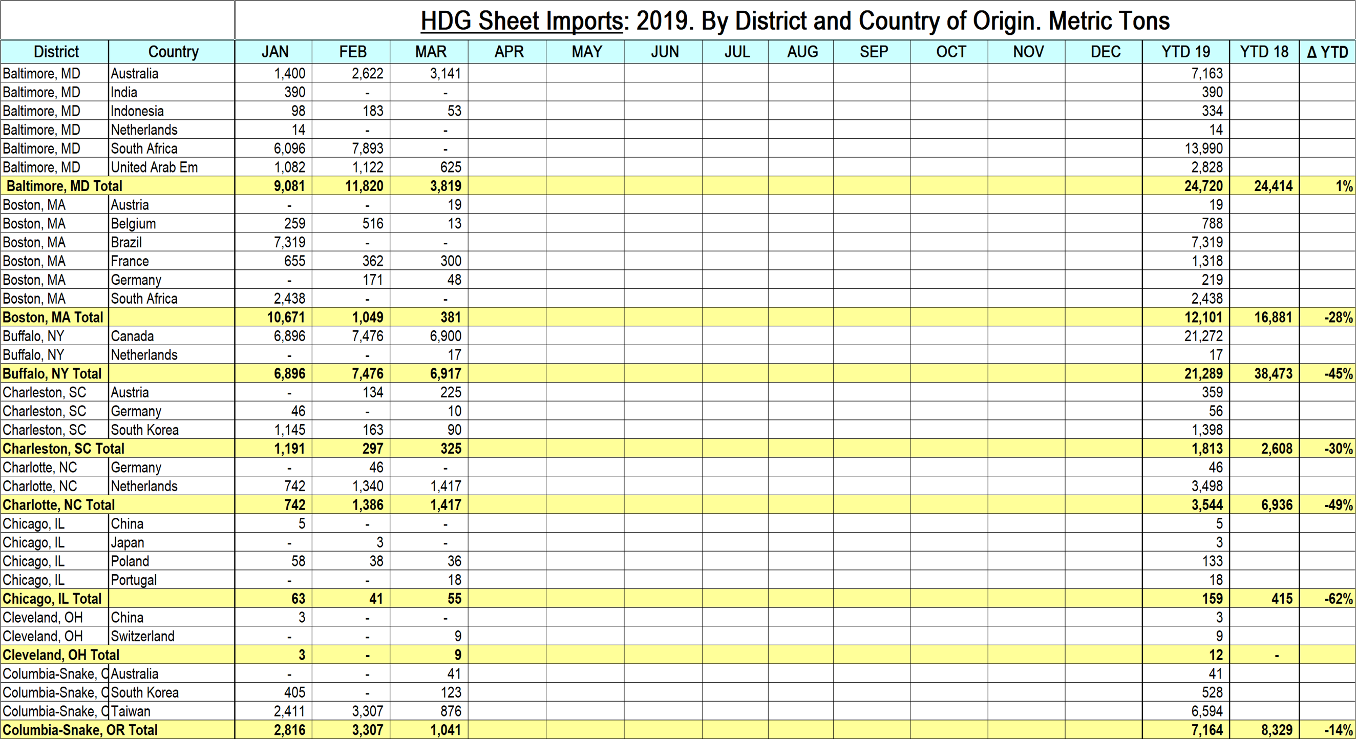 The data in these detailed reports is compiled from tariff and trade data published by the U.S. Department of Commerce and the U.S. International Trade Commission. Our national level import reports are sourced from U.S. Department of Commerce, Enforcement and Compliance, aka the Steel Import Monitoring System. In the development of these reports by district and source country, we have discovered that the SIMA data for HRC and CRC contains some high-alloy steels such as stainless and tool steel, which have been misclassified at the ports. These alloy steels are not included in our detailed reports, which results in a small discrepancy between the two data sets, for CRC in particular and for HRC to a lesser degree.