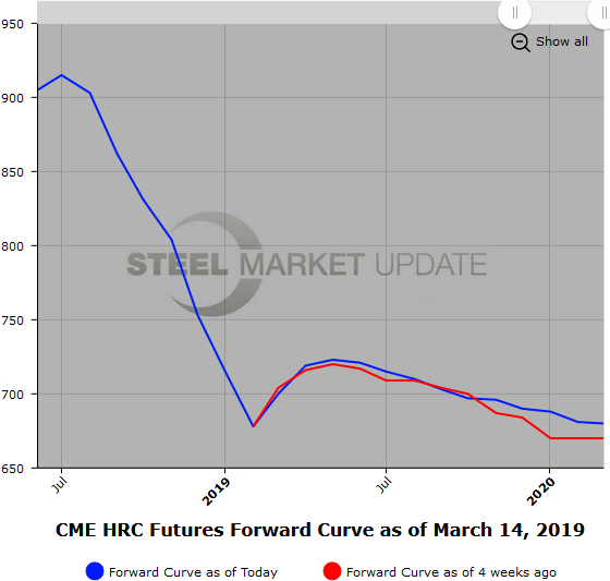 Interestingly, this month the hot rolled spot price has been edging higher on the back of the latest mill price increase announcements. However, the forward curve has been getting more backwardated. Futures activity further out on the curve suggests that the market’s not convinced prices will continue to rise. The issue of whether tariffs will keep imports subdued remains an open question. Spot HR has broken back above $700/ST as reflected in the HR indexes. Meanwhile, the forward curve for CME HR futures from April out has gotten slightly more backwardated. Beginning of the month to yesterday Apr’19 vs Dec’19 HR has widened from -$21/ST to -$25/ST ($730/$709 to $718/$693). Q2’19 HR has declined by $9/ST since the beginning of March and Q4’19 has declined by $14/ST over the same period.