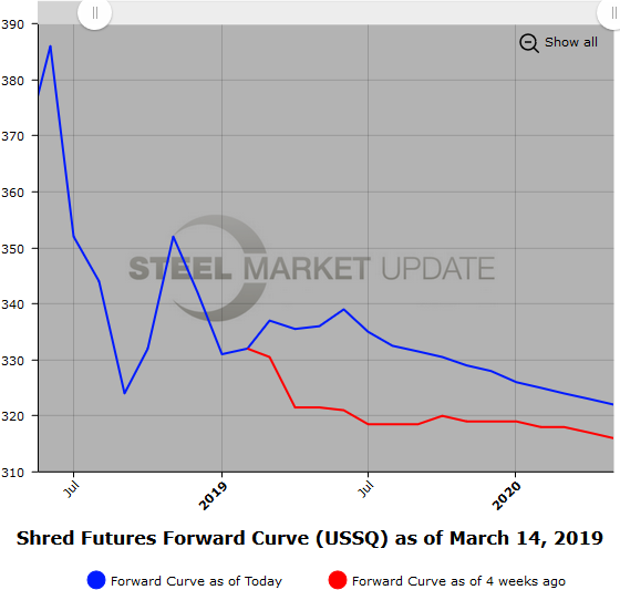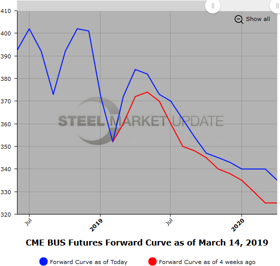 Below is another graph showing the history of the CME Group busheling scrap futures forward curve. You will need to view the graph on our website to use its interactive features; you can do so by clicking here.