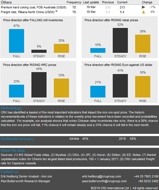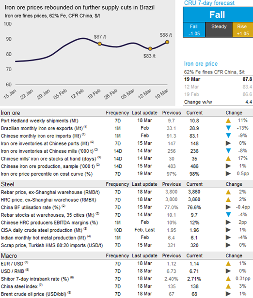 Further suspensions in Brazil lifted the iron ore market at the start of the week. Meanwhile, demand has yet to pick up in China after the National People’s Congress (NPC). On Tuesday, March 19, CRU assessed the 62% Fe fines price at $87.80 /t, up $4.40 /t w/w. This is the largest w/w price gain since the Vale accident occurred on Jan. 25.