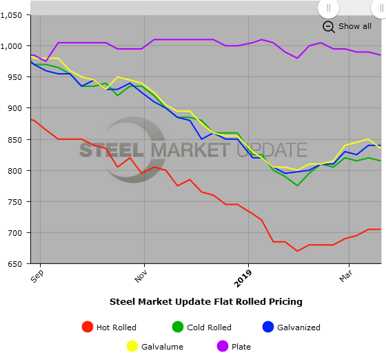SMU Note: Below is a graphic showing our hot rolled, cold rolled, galvanized, Galvalume and plate price history. This data is available here on our website with our interactive pricing tool. Note that plate prices are not yet available on our website, but we are in the process of adding that dataset. If you need help navigating the website or need to know your login information, contact us at info@SteelMarketUpdate.com or 800-432-3475.