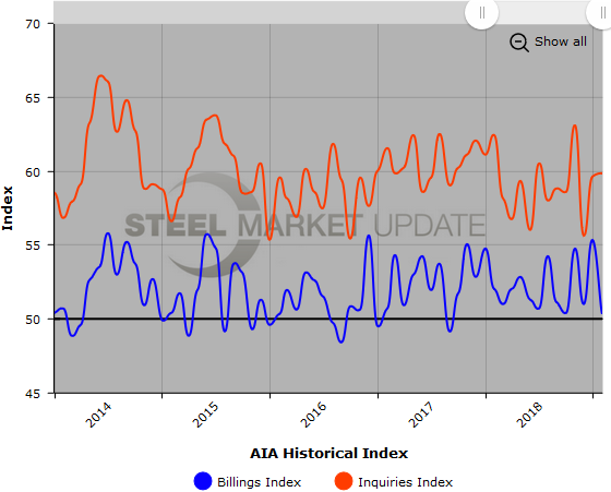 Below is a graph showing the history of the AIA Billings and Project Inquiries Indexes. You will need to view the graph on our website to use its interactive features; you can do so by clicking here. If you need assistance logging in to or navigating the website, please contact us at info@SteelMarketUpdate.com.
