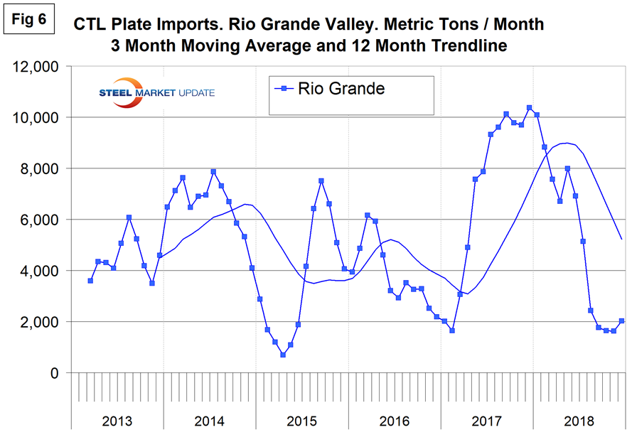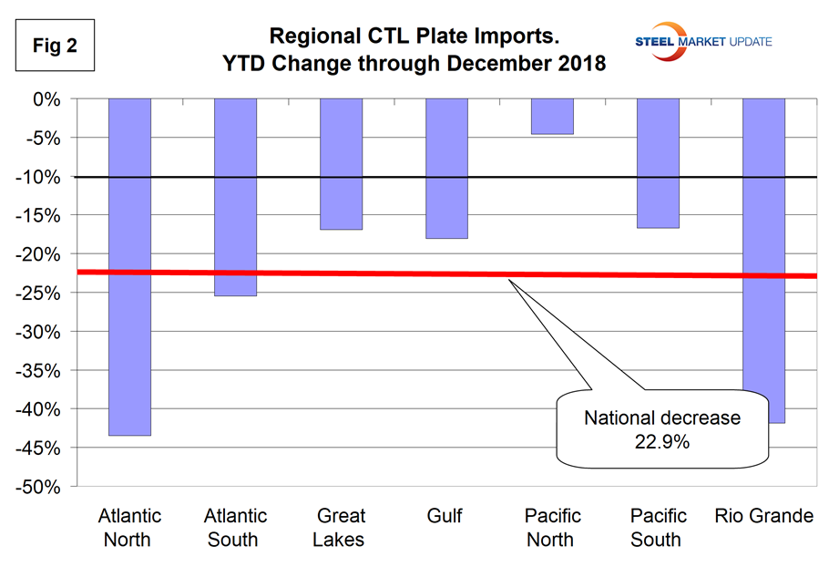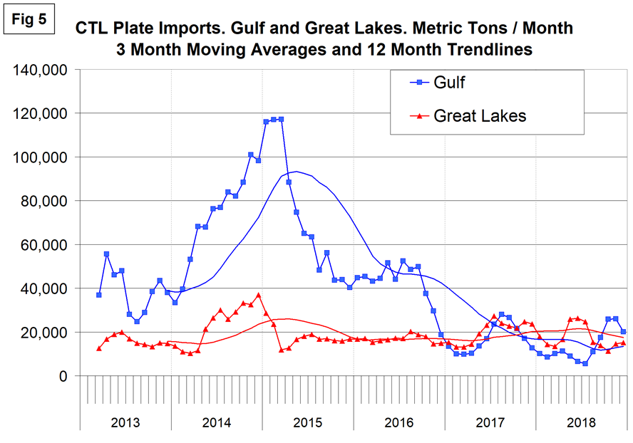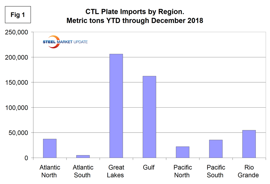 In 2018 YTD December, 39.4 percent of all cut to length plate imports came in through the Great Lakes ports. The Gulf was in 2nd place with 31.0 percent and the Rio Grande Valley third with 10.5 percent. Only 8.0 percent of the total came into the whole Atlantic coast and only 11.0 percent into the whole Pacific coast (Figure 1).