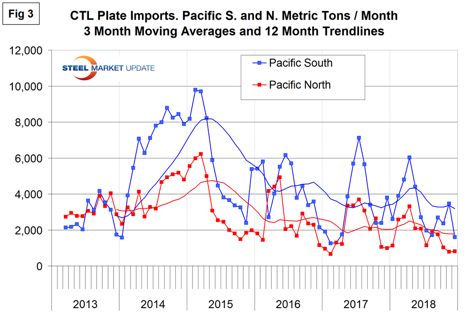 Figures 3, 4, 5 and 6 show the history of CTL plate imports by region since March 2013 on a three-month moving average basis.
