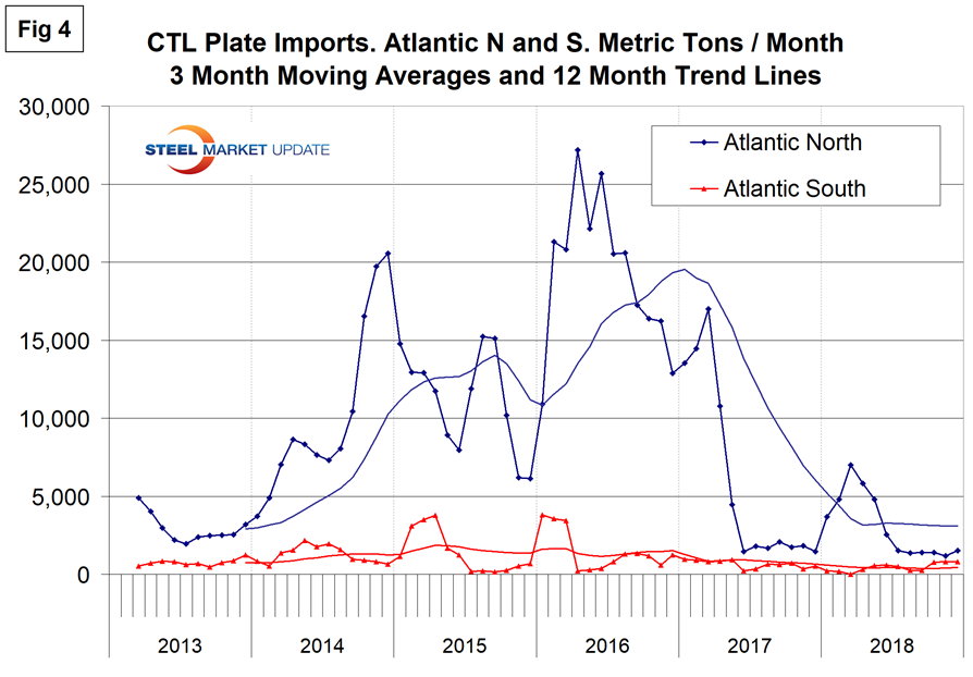CTL plate imports into the North Atlantic ports collapsed from mid-2016 to mid-2017. There was a partial recovery in early summer of 2018 before another collapse. Imports into the South Atlantic have been minimal throughout the whole time frame of this study.