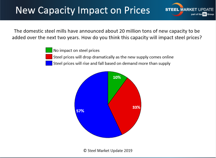 One third agree with BAML that steel prices will drop dramatically as the new supply comes online. But 10 percent expect no impact on steel prices from the new capacity. The majority, 57 percent, expect steel prices to rise and fall based on demand more than supply.