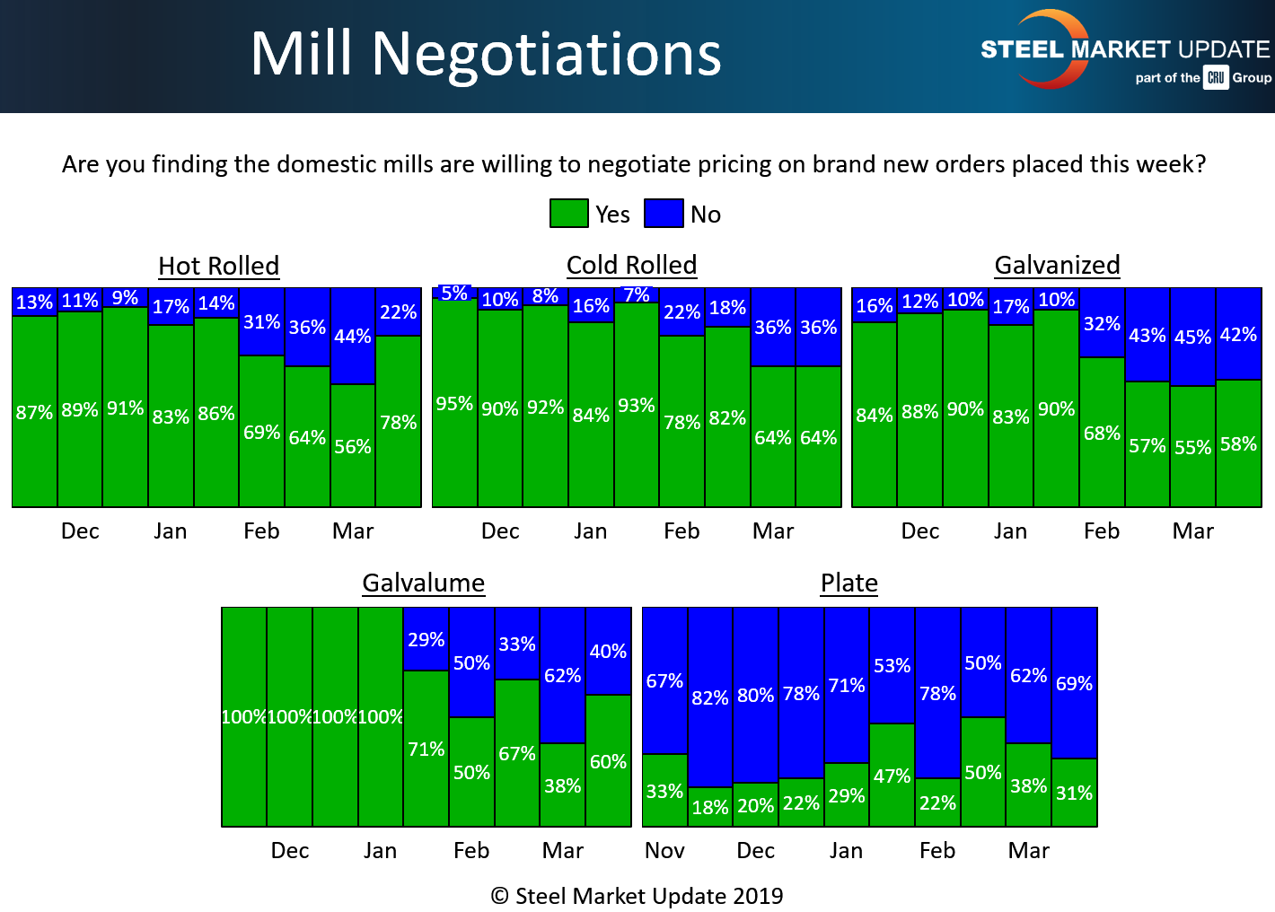 Mills are still willing to negotiate on price, especially on hot rolled, even as they work to collect the two $40 per ton price increases they announced in January and February. In every product category except plate, the majority of respondents to Steel Market Update’s questionnaire this week reported mills willing to talk price.