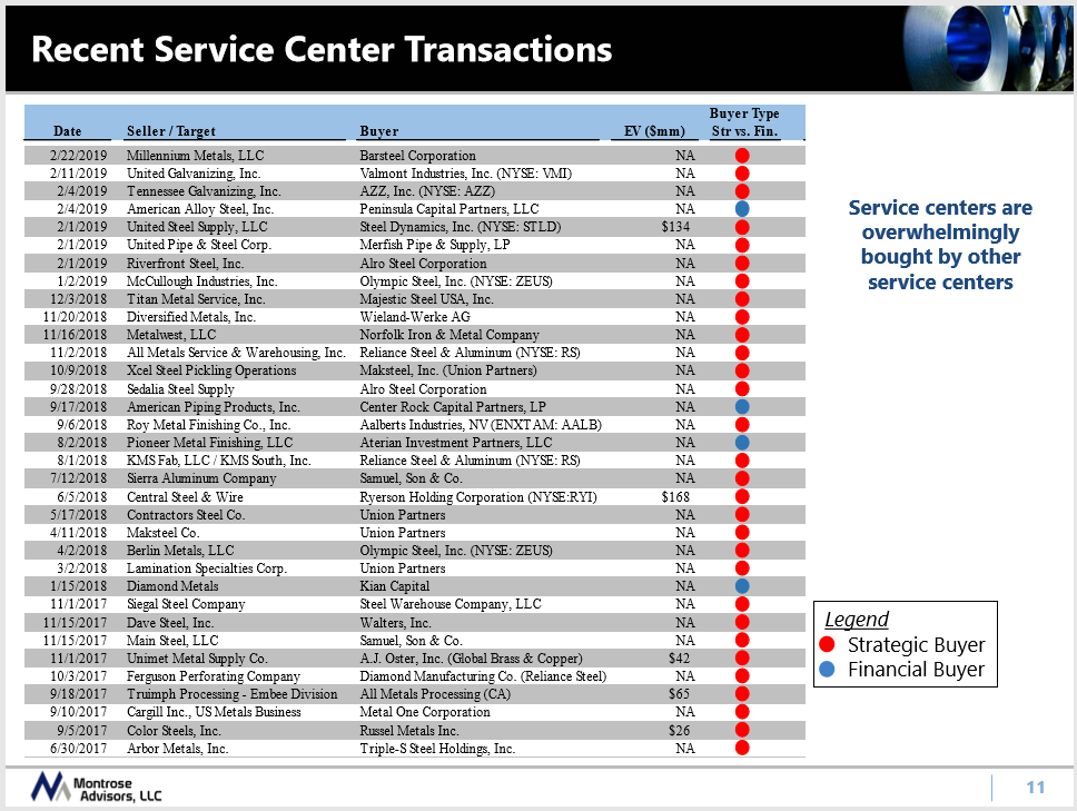 Who is buying service centers? In almost every case, other service centers (with the exception of toll processing businesses), Sullivan said. Recent service center transactions (see chart) show that it’s almost entirely strategic buyers, not financial buyers, who are active in the M&A space.