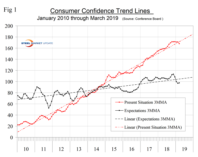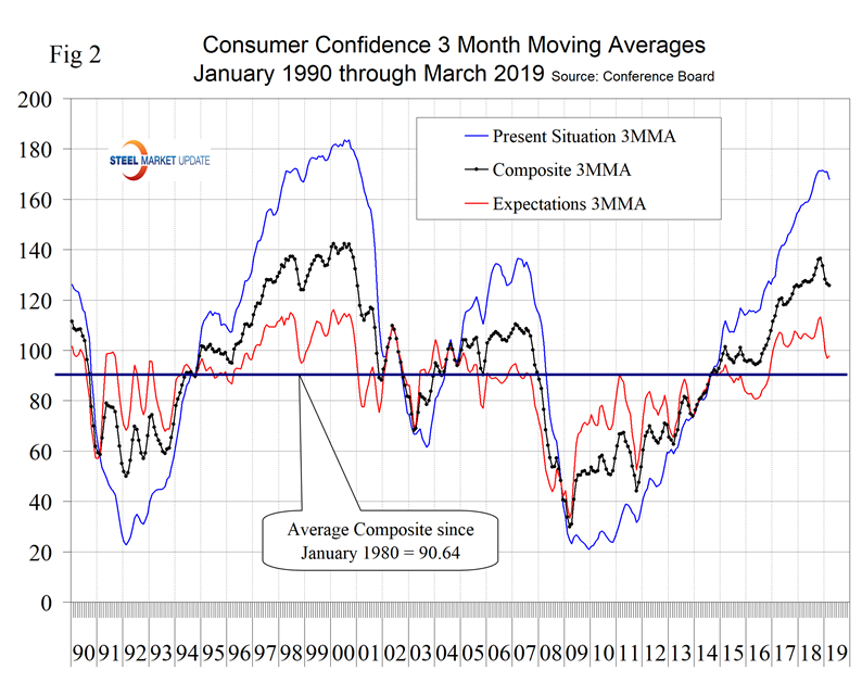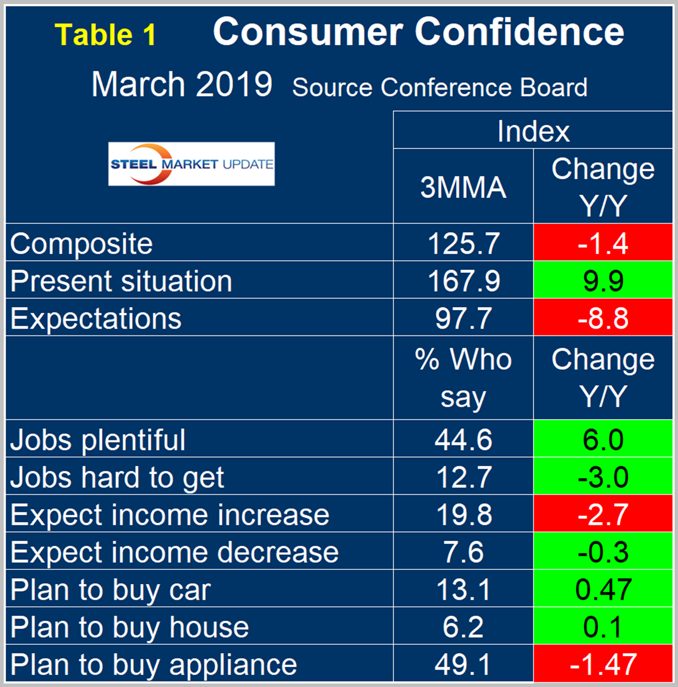On a three-month moving average basis the expectations component is now lower than it was a year ago. The consumer’s view of the present situation has surged since December 2010, but has slowed in the last six months. Comparing March 2019 with March 2018, the 3MMA of the present situation was up by 9.9 and expectations were down by 8.8 points (Table 1).
