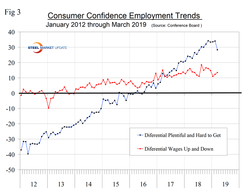 The consumer confidence report includes encouraging data on job availability as 42.0 percent of respondents reported jobs to be plentiful and 13.7 percent reported jobs hard to get. Expectations for wage increases were not so positive, as the percentage expecting a raise declined from March last year.