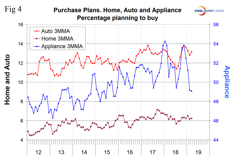 Consumer spending measures in March indicated that year-over-year plans to buy a car and a house improved, but plans to buy an appliance declined. This was an improvement from the February report when all three declined (Figure 4). Plans to buy an appliance were the lowest in over three years.