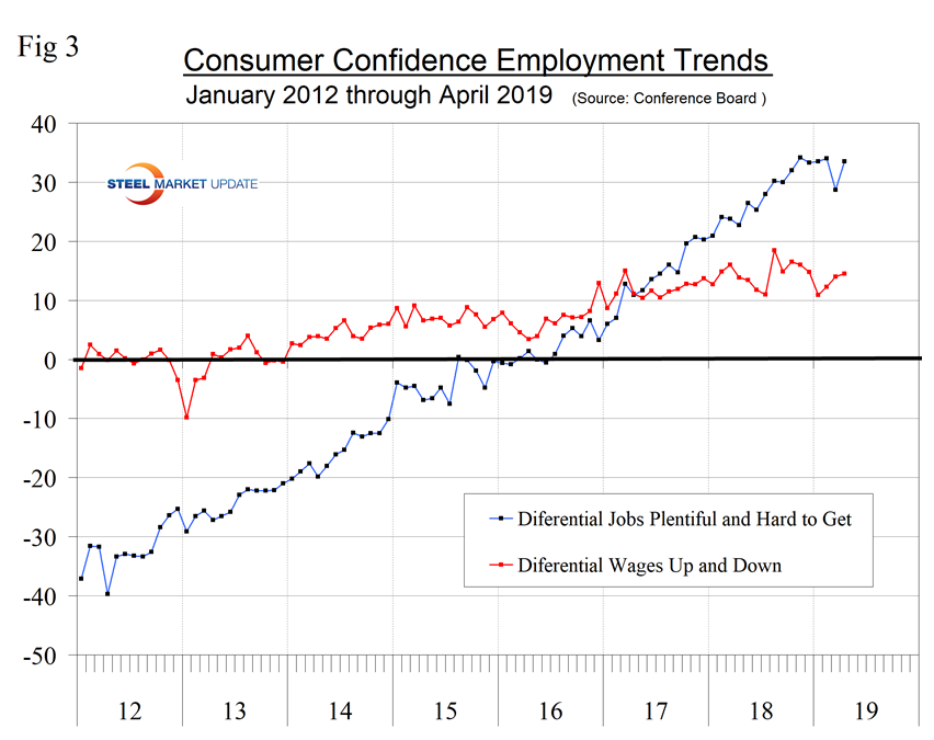 The consumer confidence report includes encouraging data on job availability as 46.8 percent of respondents reported jobs to be plentiful and 13.3 percent reported jobs hard to get. Expectations for wage increases were not so positive, with a small net increase in the proportion of respondents expecting an increase.