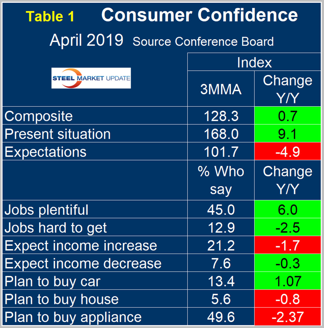 On a three-month moving average basis, the expectations component is now lower than it was a year ago. The consumer’s view of the present situation is better than it was a year ago. Comparing April 2019 with April 2018, the 3MMA of the present situation was up by 9.1 and expectations were down by 4.9 points (Table 1).