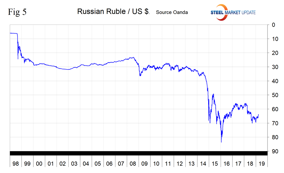 In each of these reports, we describe the history of several of the 16 steel and iron ore trading currencies listed in Table 1 and over a period of several months will give details on all of them. Charts for each of the 16 currencies are available through March 22 for any premium subscriber who requests them.